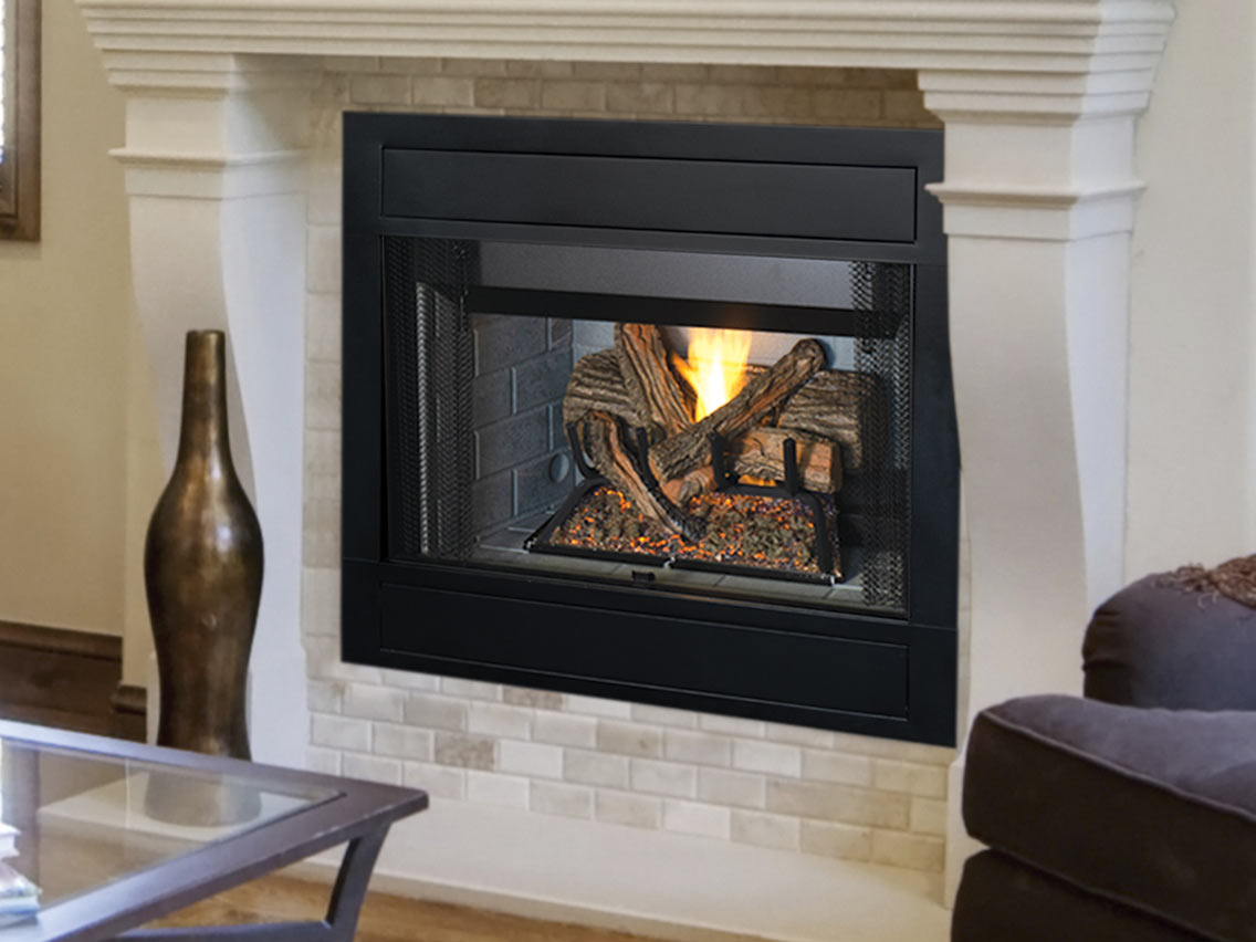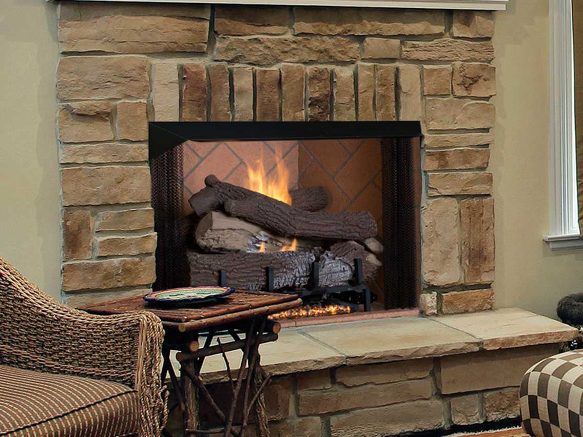 Today’s factory-built, open-hearth, wood-burning fireplaces offer the look and feel of a traditional masonry-constructed fireplace at a much lower installed cost. They also are considered a “dual-fuel” appliance in that they can be used to burn natural wood or be retrofitted with gas log sets. Because the chimney system can withstand the higher temperatures of burning wood, it can also accept gas log sets that burn with larger flames than a gas-only fireplace. Combined with heavy-duty grates and realistic ember beds, a wood-burning fireplace combined with a vented gas log set is an option to consider if you want a decorative fireplace.